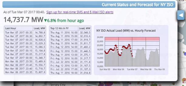 Click on the top left flyout panel to see real-time demand and a three-day forecast from NY ISO. The compiled data comes